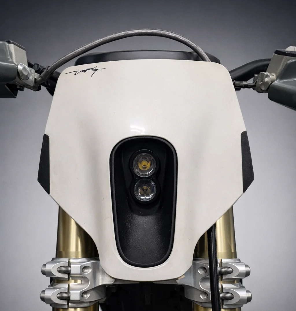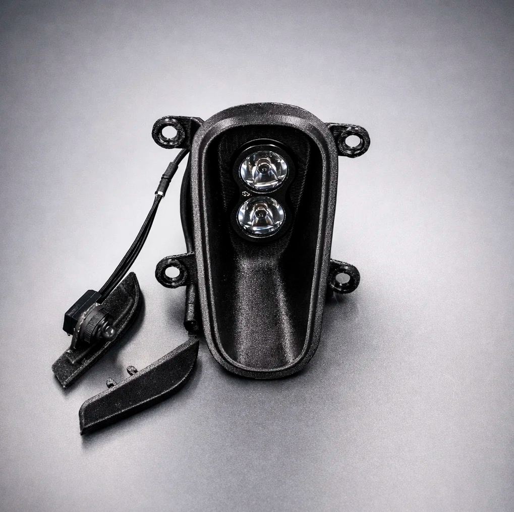 Конструкция светодиодной фары «Сова» для электромотоцикла Stark Varg — это синергия двух ключевых элементов: мощного светового модуля «Маяк» и специальной кастомной вставки.